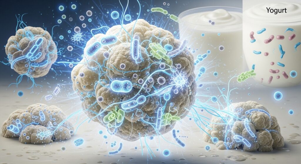 코카서스 산맥의 장수 마을에서 유래한 ‘케피어(Kefir)’는 단순히 걸쭉한 우유가 아닙니다. 겉모습은 요거트와 비슷하지만, 그 속을 들여다보면 차원이 다른 미생물 생태계가 펼쳐집니다. 요거트가 특정 유산균의 활동 결과물이라면, 케피어는 ‘케피어 그레인(Kefir Grains)’이라는 살아있는 미생물 결정체가 빚어낸 복합 발효의 정수입니다.