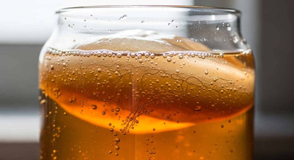 1차 발효 단계입니다. 달게 끓인 차(설탕을 넣은 홍차 또는 녹차)에 스코비와 이미 완성된 콤부차 스타터액을 넣고 7~14일간 발효시킵니다. 이 과정에서 효모가 먼저 설탕을 분해해 알코올과 이산화탄소를 생성합니다. 이어서 초산균이 이 알코올을 산화시켜 초산(Acetic Acid)을 만듭니다. 유산균은 유기산을 생성하고 다양한 생리 활성 물질을 만들어냅니다.