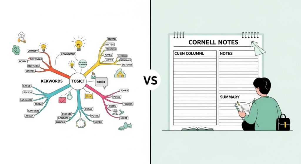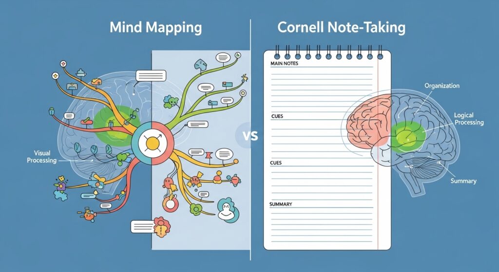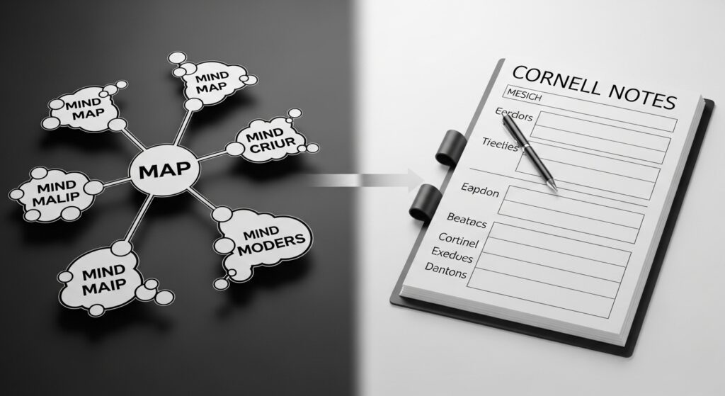 이 하이브리드 전략은 마인드맵의 시각적 구조 파악 능력과 코넬 노트의 체계적 복습 효율을 동시에 활용하는 최적의 방법입니다.