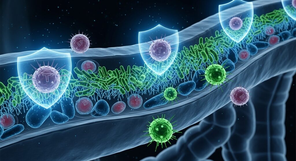 장내 미생물은 면역 시스템에게 두 가지 핵심 원칙을 가르칩니다. 첫 번째는 무해한 것과 유해한 것을 구별하는 방법입니다. 유익균은 면역세포가 무해한 음식 단백질이나 공생 미생물에게는 과도한 반응을 하지 않도록 훈련시킵니다. 이 훈련이 제대로 이루어지지 않으면 알레르기나 자가면역 질환이 발생할 수 있습니다.